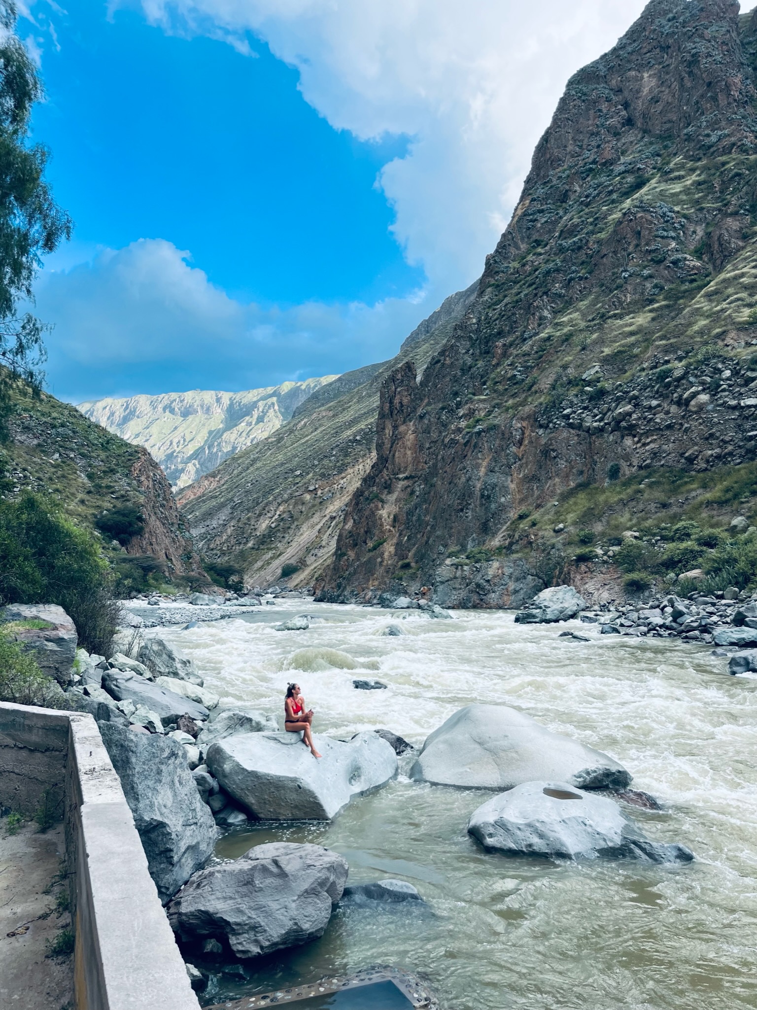 Als je op zoek bent naar een unieke overnachtingsplek, dan is Llahuar Lodge een absolute aanrader. Deze lodge ligt direct aan de oevers van de rivier in het hart van Colca Canyon. Het is een eenvoudige maar comfortabele accommodatie met restaurant. De echte highlight zijn de hotsprings waar je in alle rust kunt ontspannen. Er bevindt zich één hotspring beneden onderaan de trap. Maar als je over het muurtje kijkt zie je nog drie andere hotsprings. Deze zien er misschien niet heel aantrekkelijk uit maar schijn bedriegt: het water is heerlijk warm en met op ooghoogte de woeste rivier maakt het echt prachtig.